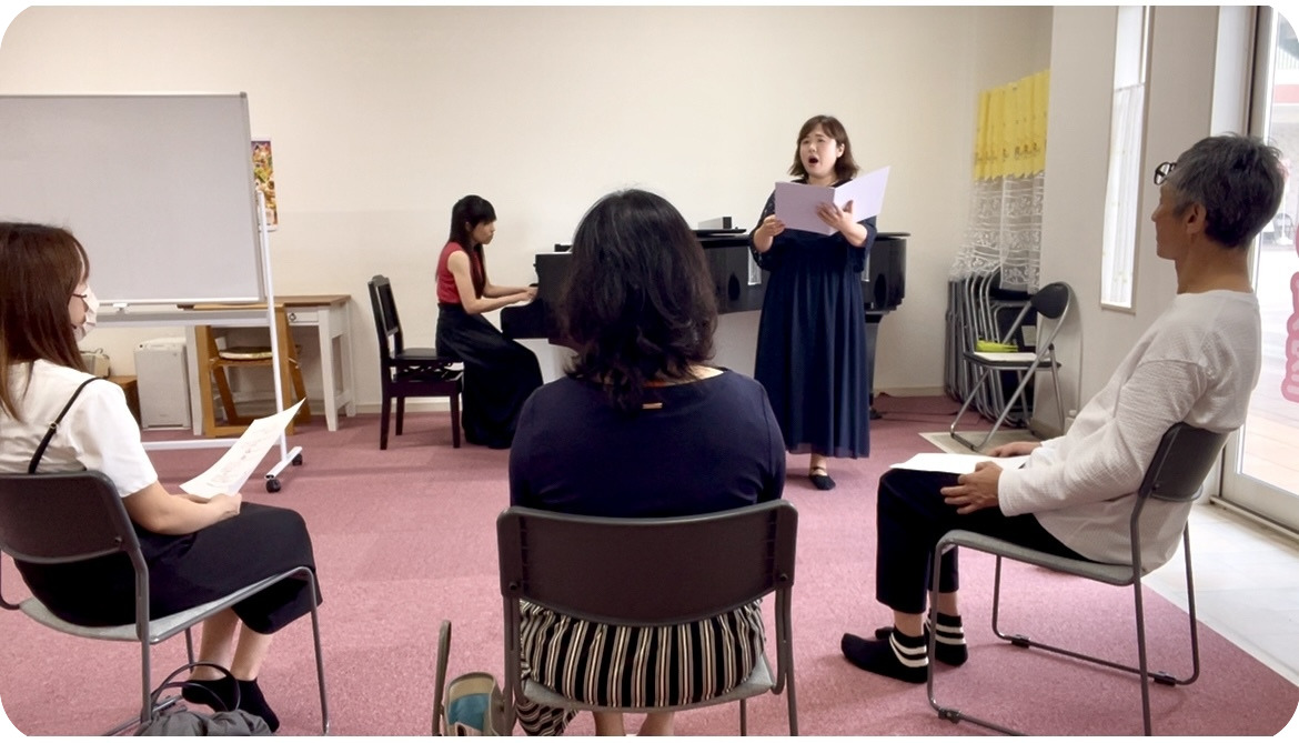 名曲の数々をコーラスレッスンでも定評のある先生の心地よい歌声と華やかなピアノ演奏でお届けしました。また、ご参加の皆さまと一緒に楽しめるコーナーでは歌に合わせながら手拍子をして楽しみました。