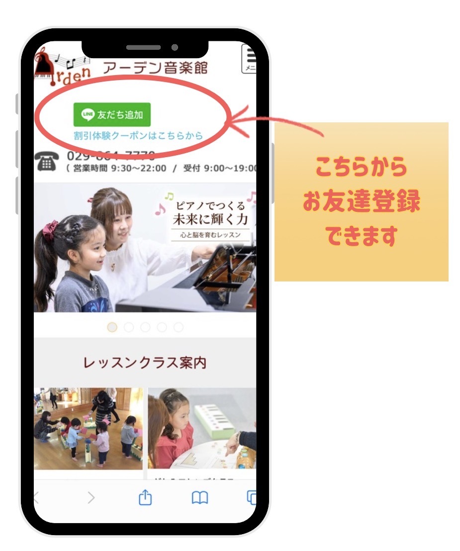 アーデン音楽館のホームページから公式LINEのお友達にご登録していただいた方限定で、体験レッスン料金通常1000円のところ、半額になるお得なクーポンをお配りしています♪