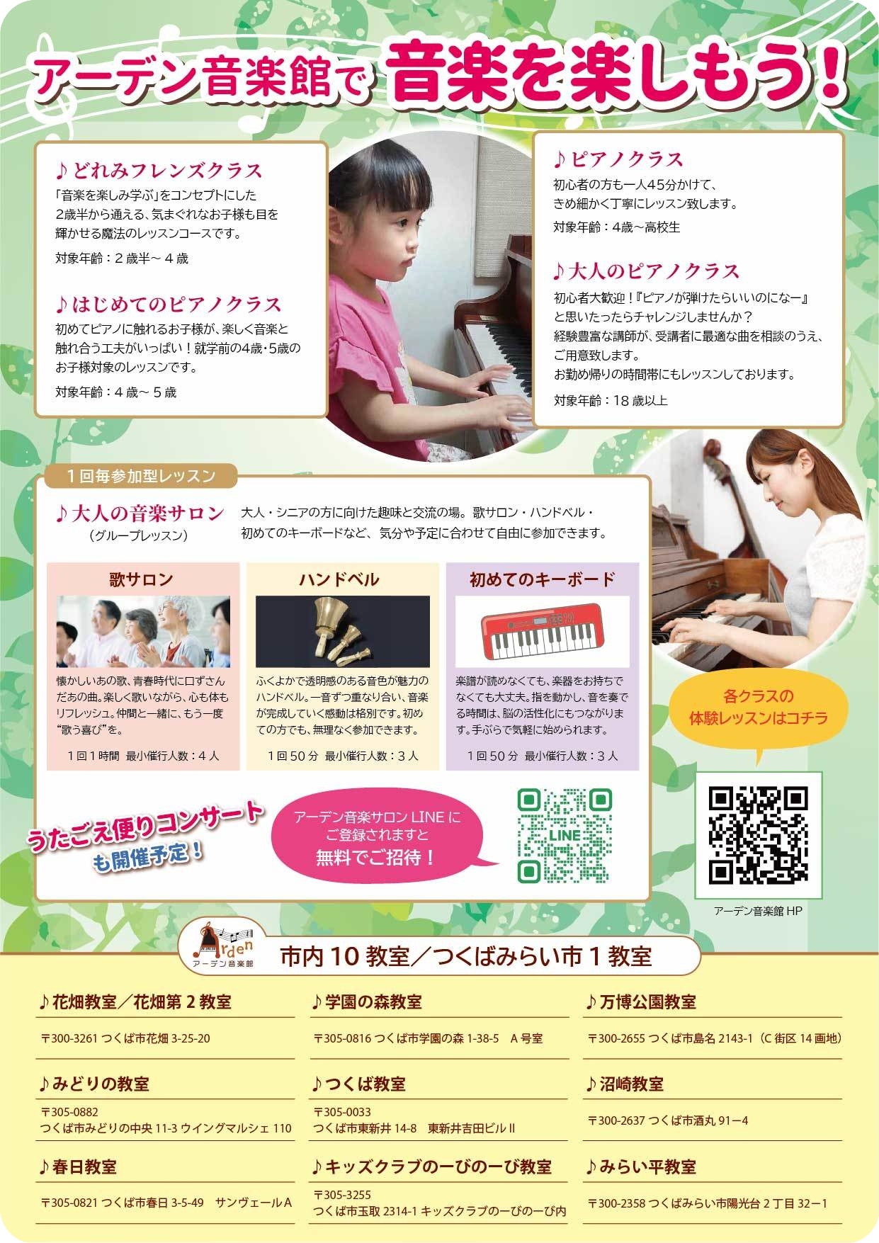 ・どれみフレンズ(2〜4歳) ・はじめてのピアノ(4〜5歳) ・ピアノクラス(4歳〜高校生)
